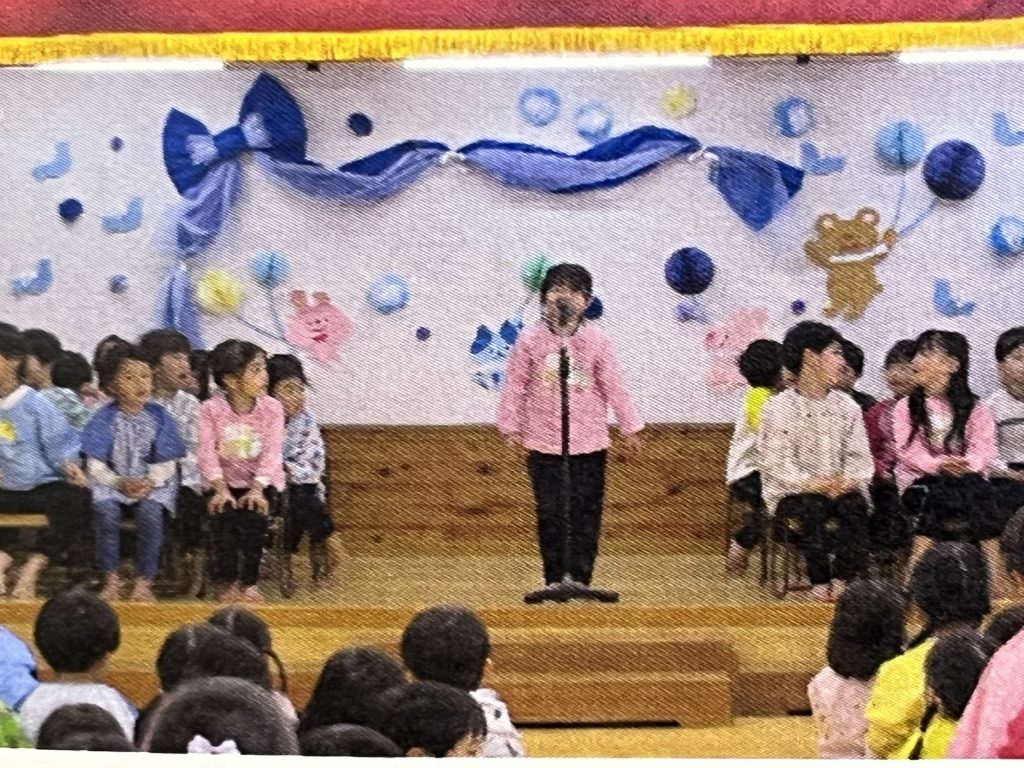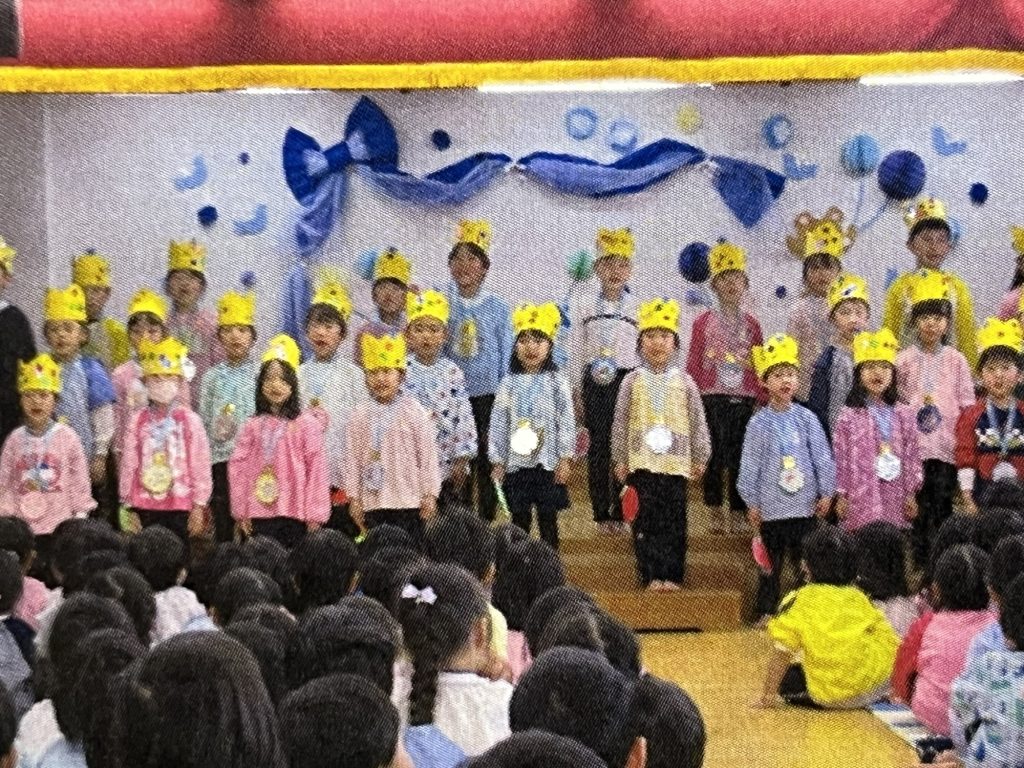 ふじ組さんは、4月から1年生です。1人ずつ、どこの小学校に行き、どんな事を頑張るかを宣言しました。在園時から手作りの冠などのプレゼントがありました。