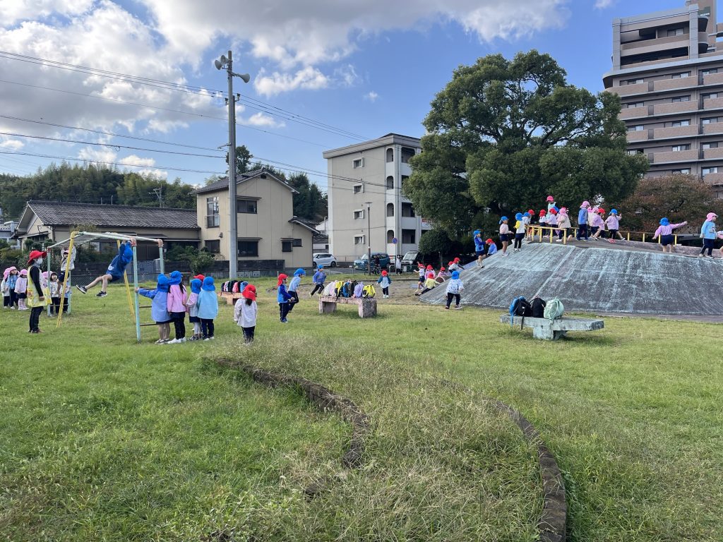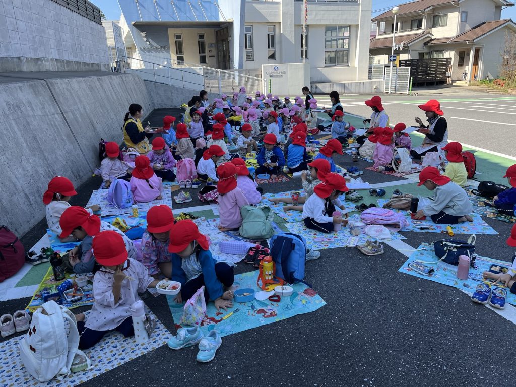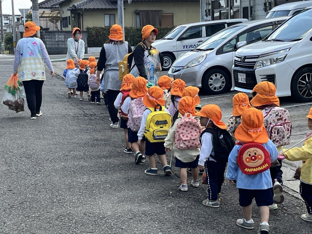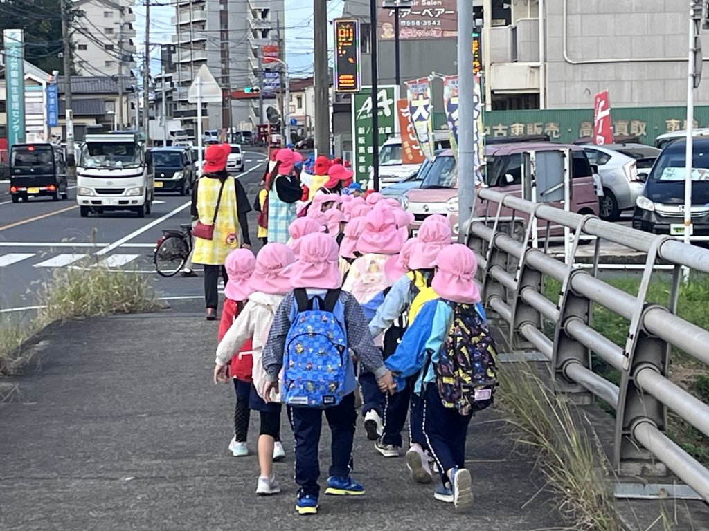 リュックを背負ってお散歩えんそく。高城駅の見える公園には、ふじ、もも、ばら、の3クラスが、ひまわりは、仲西公園、他のクラスは園の周辺をおさんぽ。