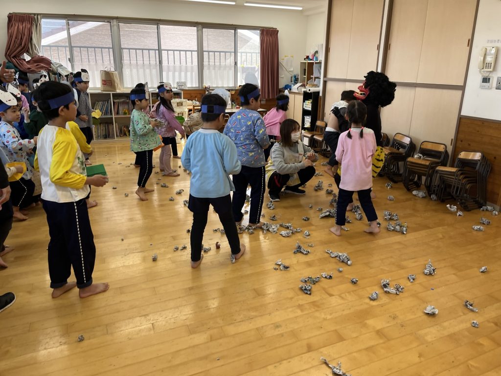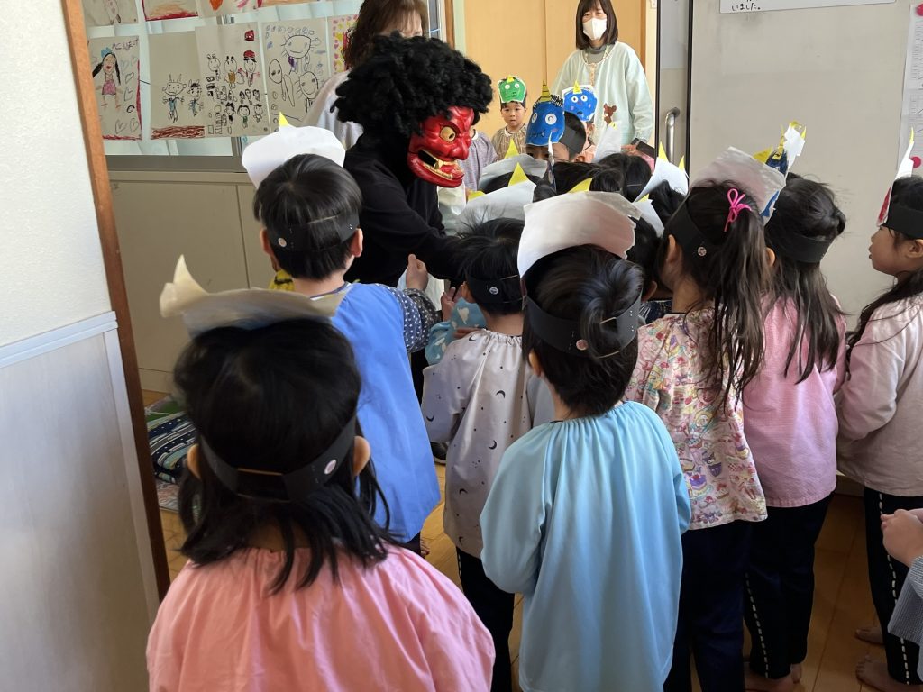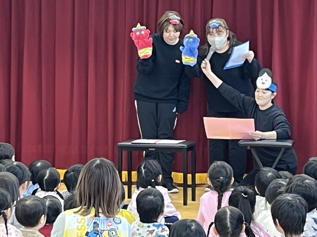 節分のお楽しみ会がありました。お人形さんのお話から、こわい赤鬼さんがやってきました。